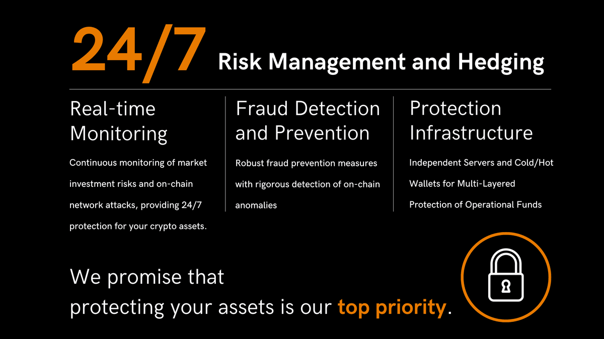 Focused on blockchain profit solutions, our team brings over 5 years of experience in asset management. We adapt to current market conditions to develop diverse cryptocurrency profit channels. These include partnerships with centralized and decentralized exchanges, hedging and spot-futures arbitrage systems, on-chain staking, and lending. Our goal is to help users achieve stable and reliable returns.